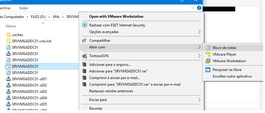 Logo após, localize e abra (com o botão direito) com o bloco de notas o arquivo com extensão .vmx