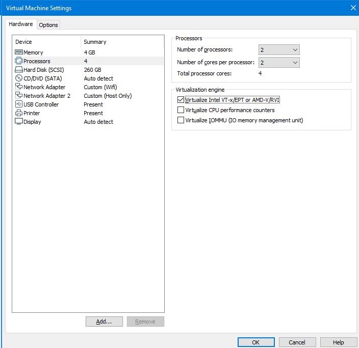 Com a máquina virtual desligada, vá na aba configurações da máquina virtual desejada, clica em Processador e habilite o campo Virtualize Intel VT -x/EPT or AMD-V/RVI